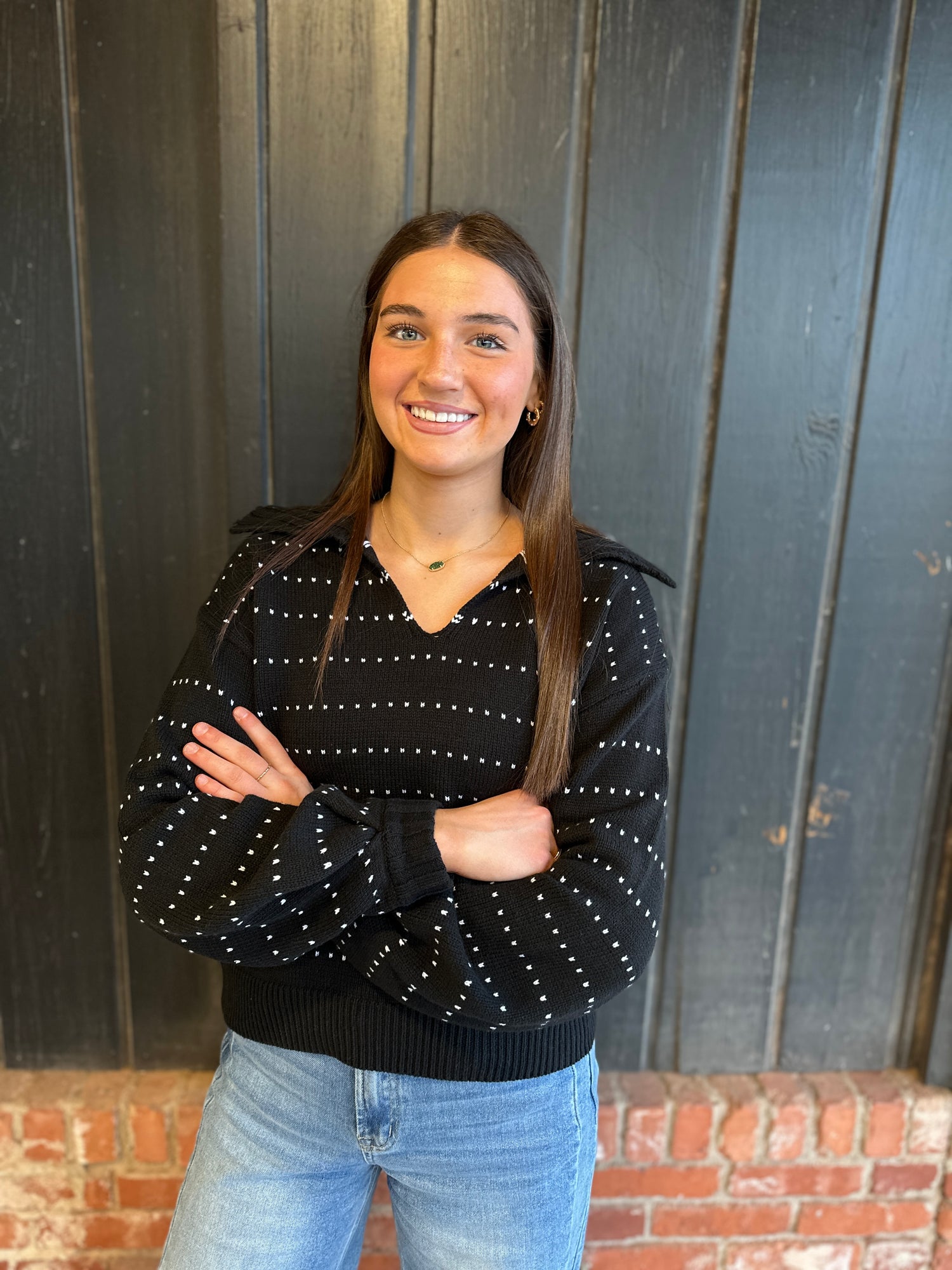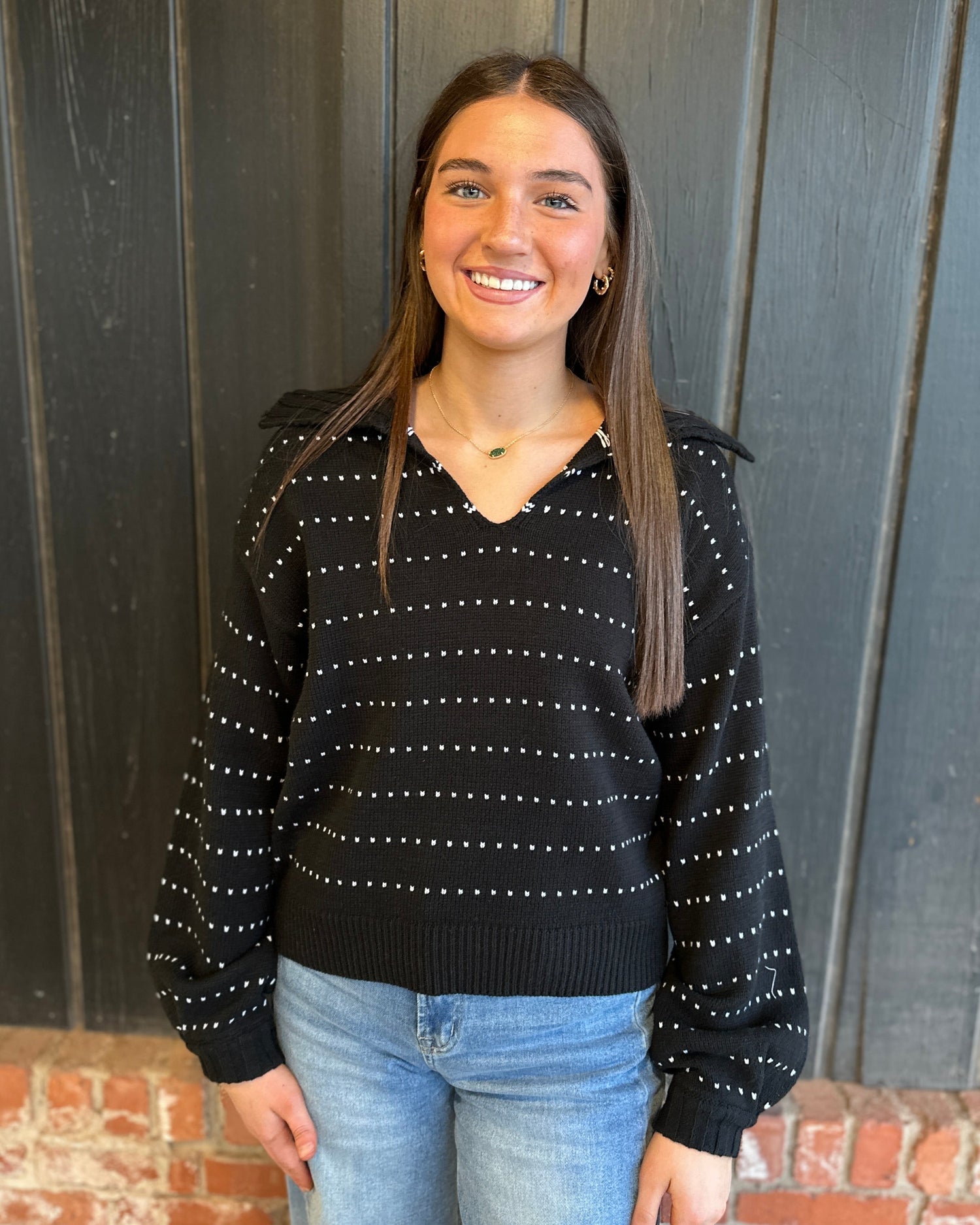 A cozy pullover with a playful twist—this knit features dainty heart-dot stitching throughout and a soft, slouchy collar for a lived-in feel. The relaxed fit and subtle texture make it the sweetest grab-and-go for your off-duty days.