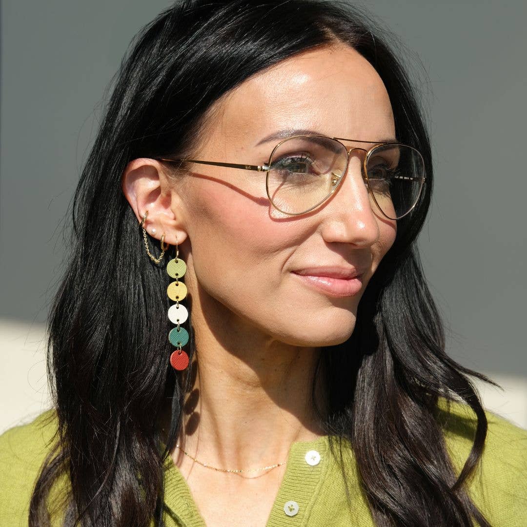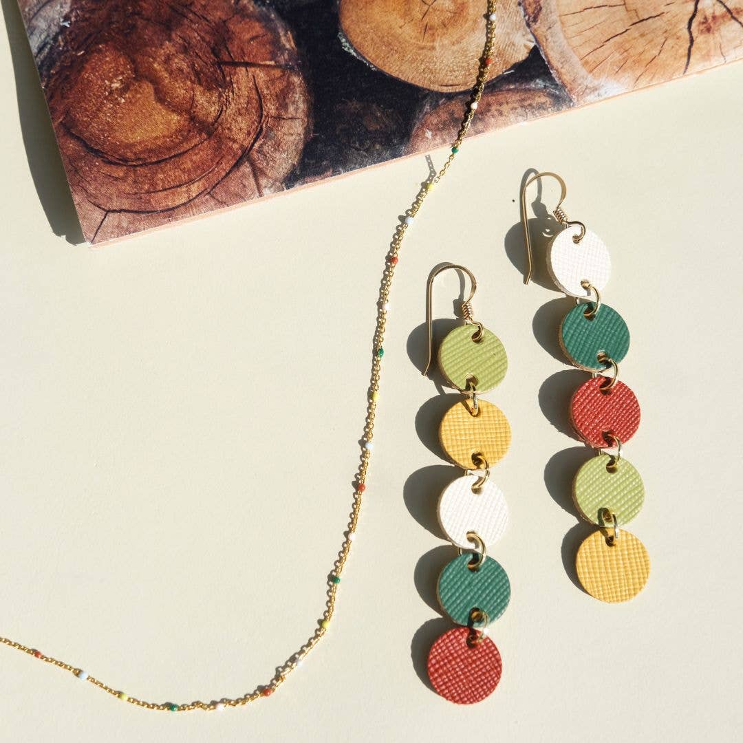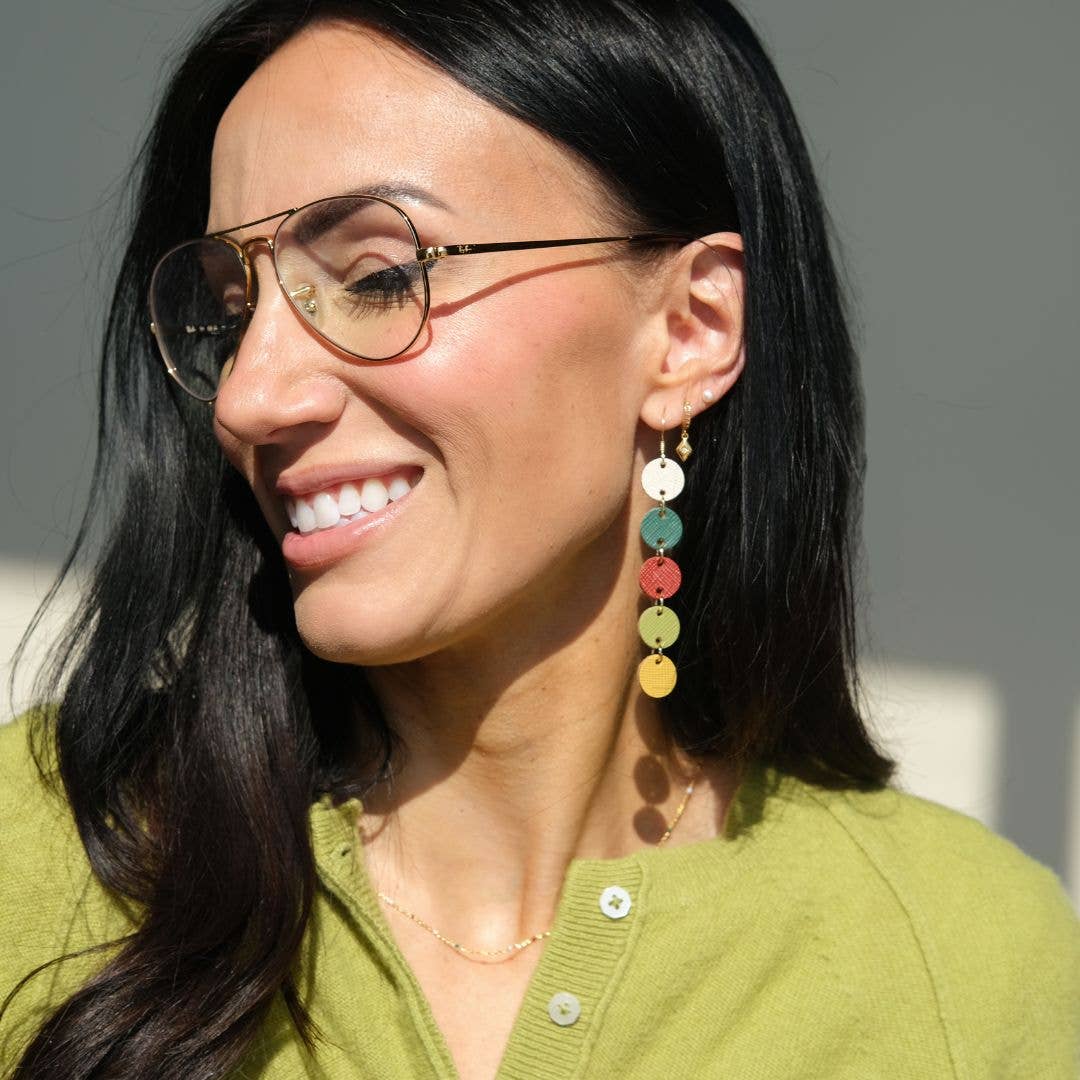 Made with a variety of our Marigold, Cactus, Auburn, Dark Green and Blank Canvas, the Autumn Harvest Sylvie is the perfect fall statement earring. This lightweight earring has fun movement and color, allowing you to be unique and versatile with style.