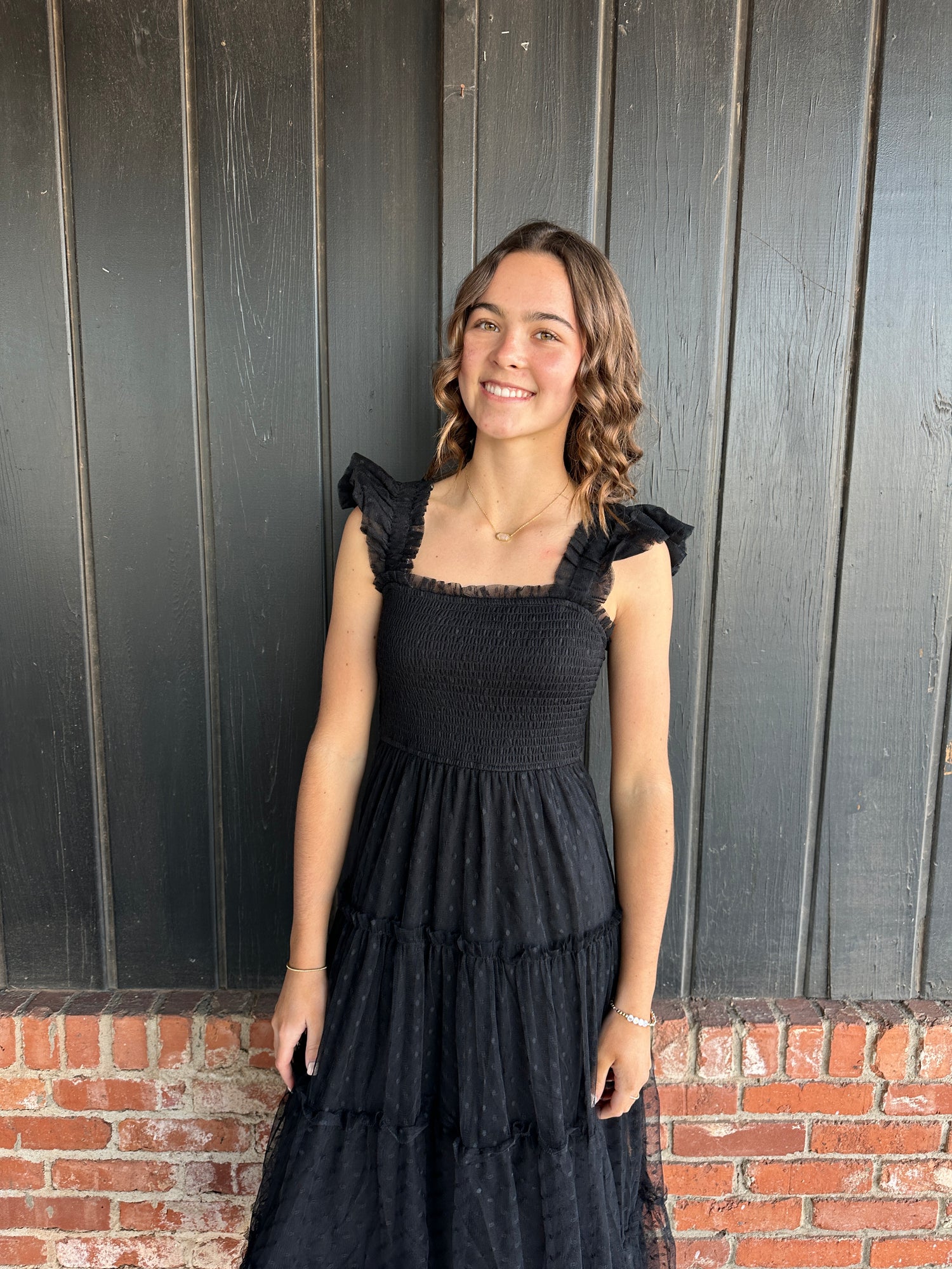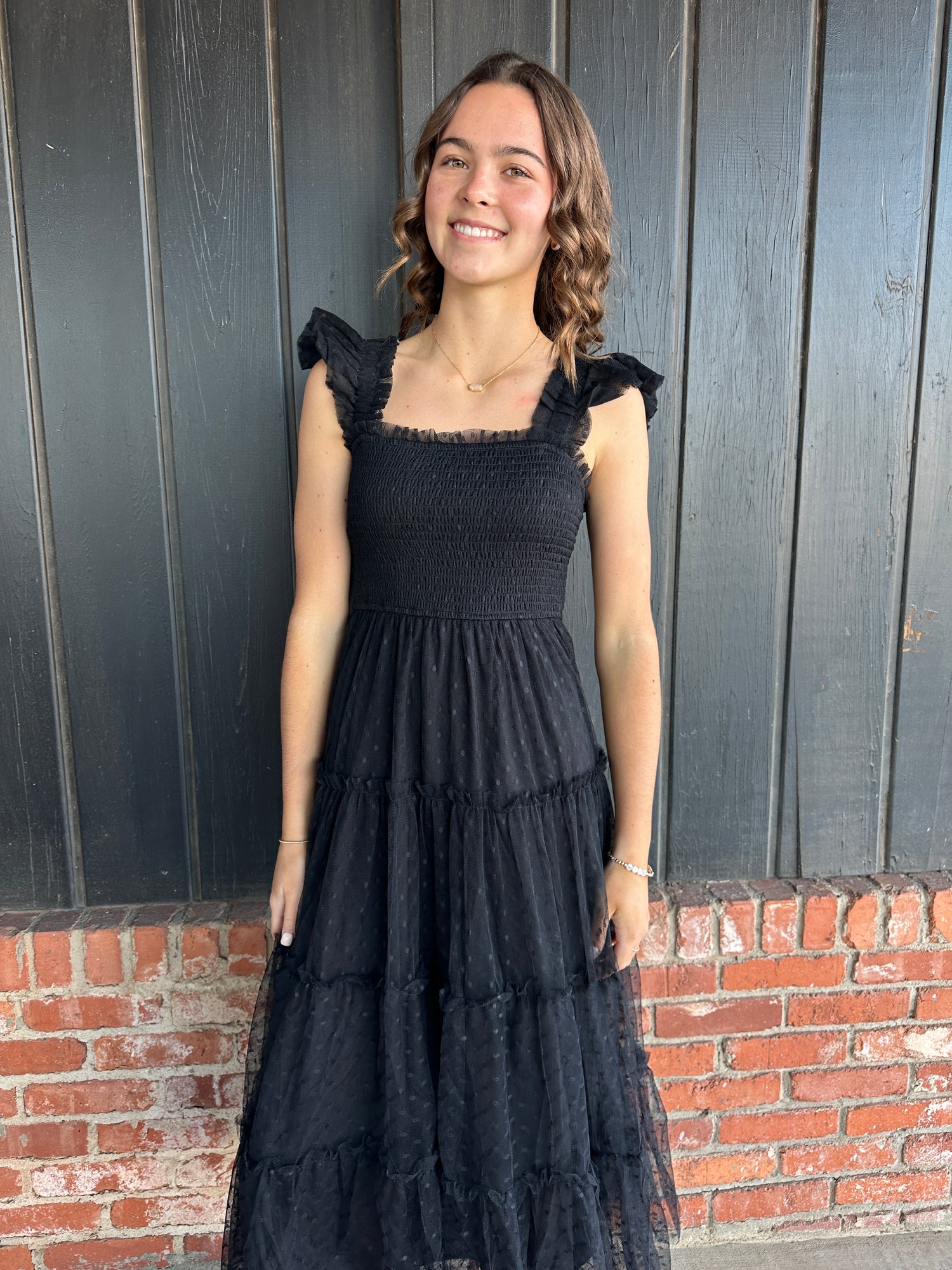square neckline sleeveless elastic straps smocked bodice ruffle trim tiered polka dot chiffon pattern lined midi dress shell: 100%polyester lining: 100%polyester