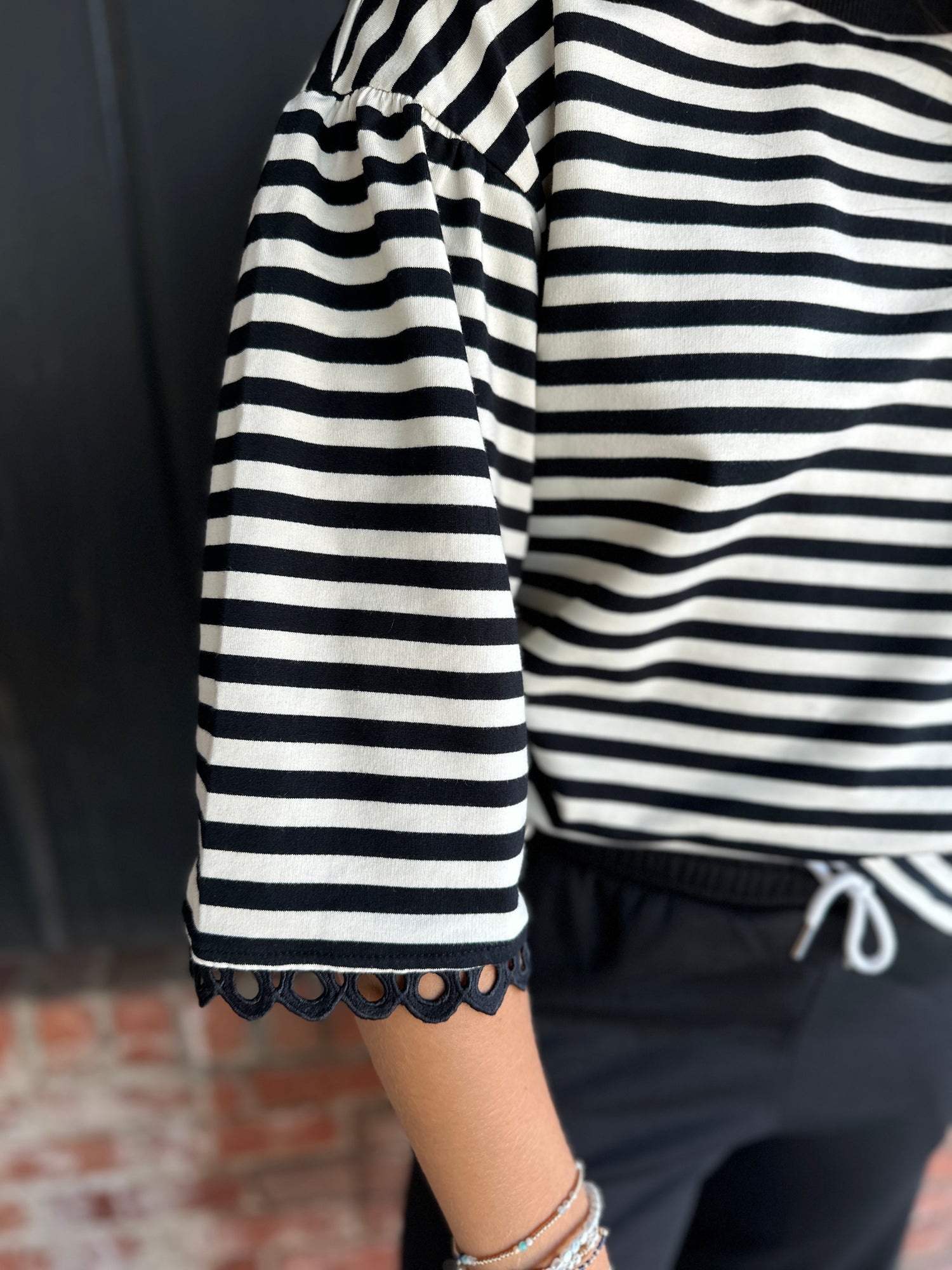 Wide 3/4 sleeves stripe top with lace trim accent, drop shoulder, slightly side slit.