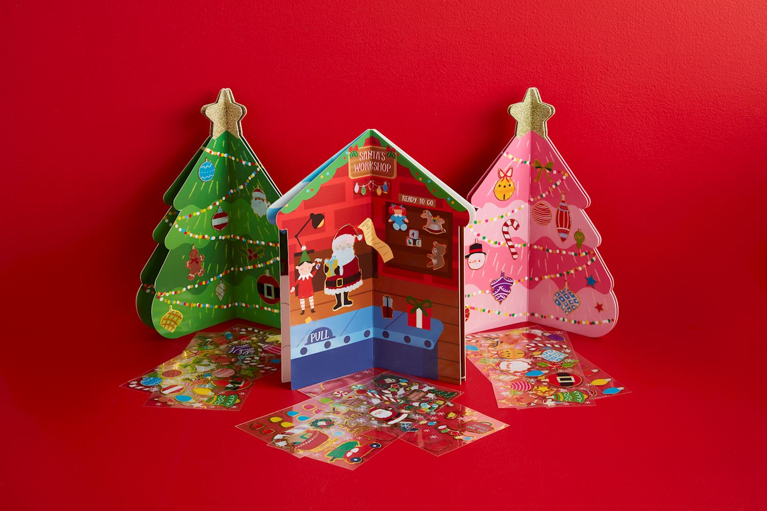 Decorate dimensional folding Christmas tree or gingerbread house booklet with included stickers