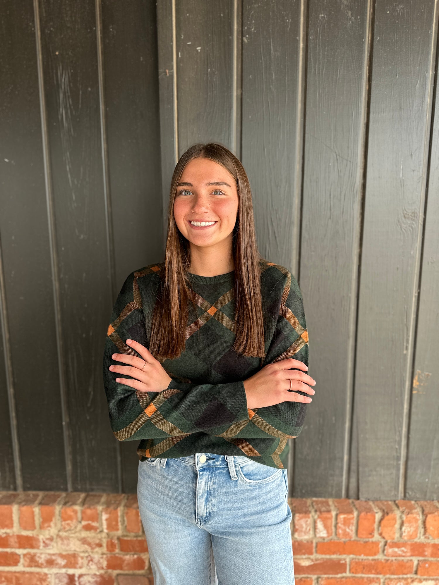 Checker jacquard, crew neck, long sleeve, heavy pullover sweater