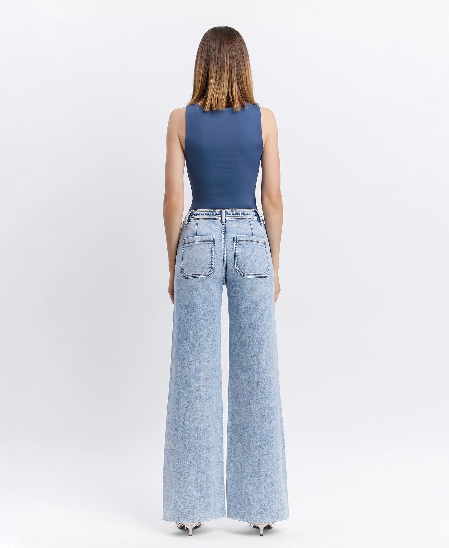 High rise drawstring waistband wide leg jeans Comfort stretch denim, high rise waist, drawstring waistband, utility pocket detail, raw hem, full length, wide leg jeans F. Rise: 10" / inseam: 32" / leg opening: 23" Model is 5'9" wearing a size 26