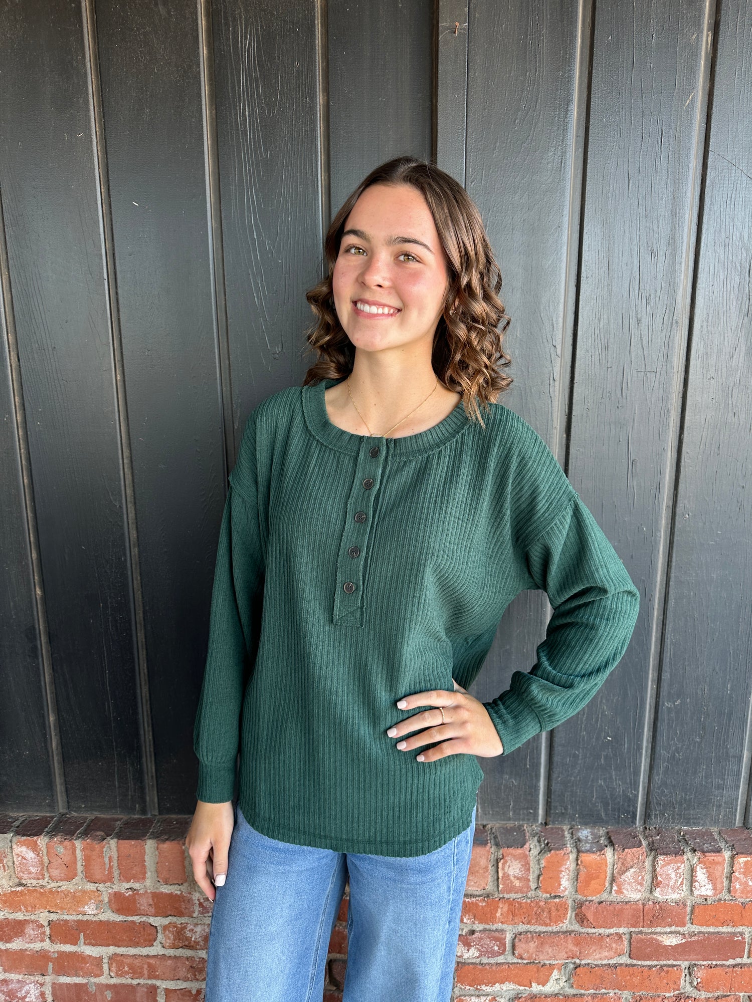 ROUND NECKLINE HENLEY NECKLINE HALF BUTTON DOWN LONG SLEEVES DROP SHOULDER EXPOSED SEAM DETAIL SOLID RIBBED PATTERN KNIT TOP 97%POLYESTER 3%SPANDEX