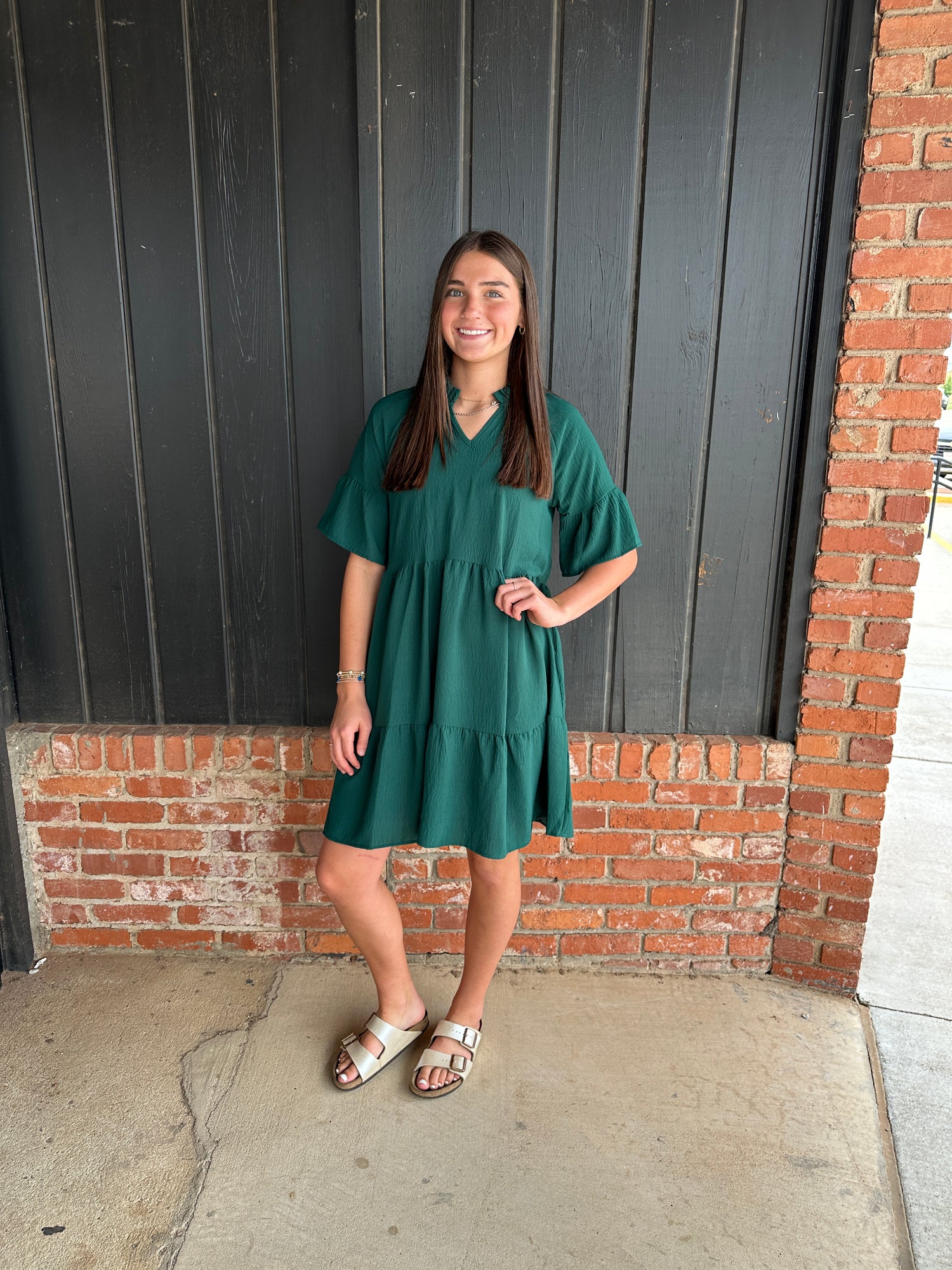 Solid tiered dress Ruffled gathered neckline V neck cut out Ruffle bell half sleeve Tiered flowy body Side pockets Solid air flow fabric Devin is 5'8" Bust 32 - Waist 24 - Hips 34 Here she's wearing a size S Size S HPS Length is 37"