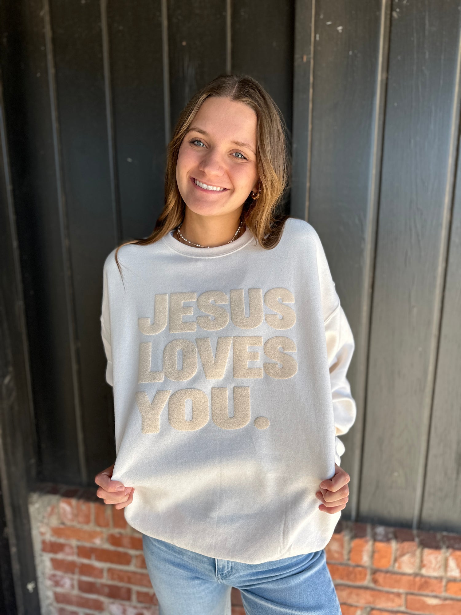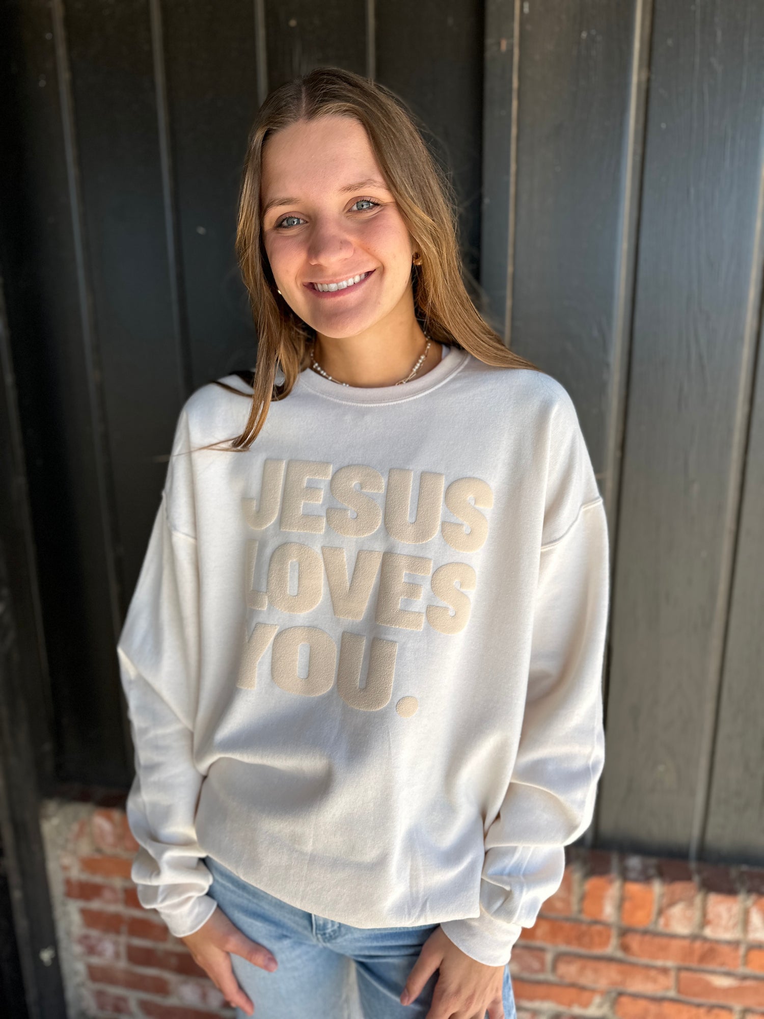 'Jesus Loves You' Puff Sweatshirt redefines comfort and style. This women's graphic sweatshirt, crafted with an exclusive design, is a testament to our love for unique creations and our commitment to your style goals.