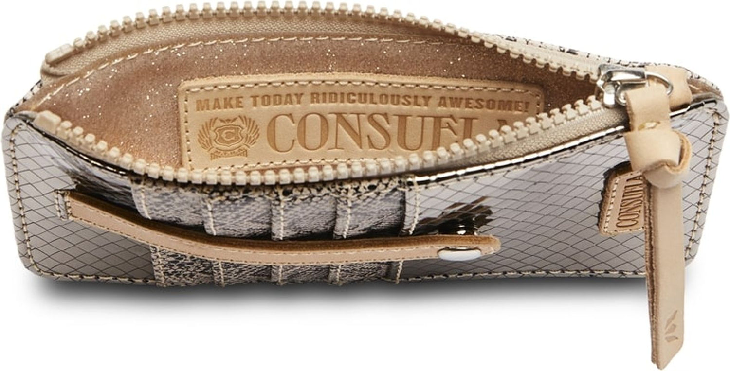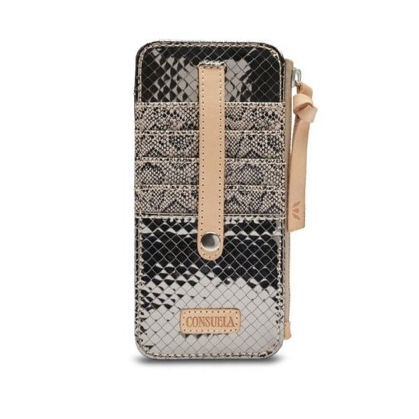 Description: "Keeping things light and easy, the card organizer is perfect for credit cards and folded bills. This wallet?s snap-closure and zipper compartment provides security while you take on the day. Gunmetal textured synthetic exterior. Wynn textured snake print detailing with five card slots and ID pocket Cash zipper compartment. Snap closure to keep cards secure. Trimmed in natural, untreated leather