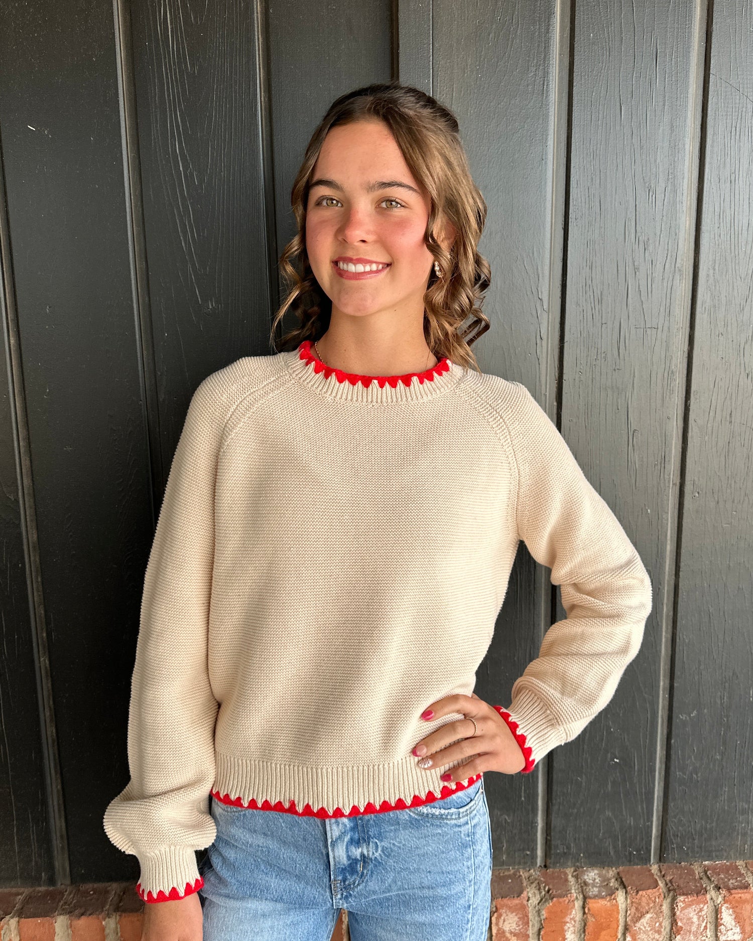 + Contrast blanket triangle stitch puff sleeve sweater + Ribbed round neckline with contrast blanket triangle stitch + Raglan seams + Long puff sleeves + Fitted cuffs with contrast blanket triangle stitch + Banded ribbed hem with contrast blanket triangle stitch + Relaxed fit bodice
