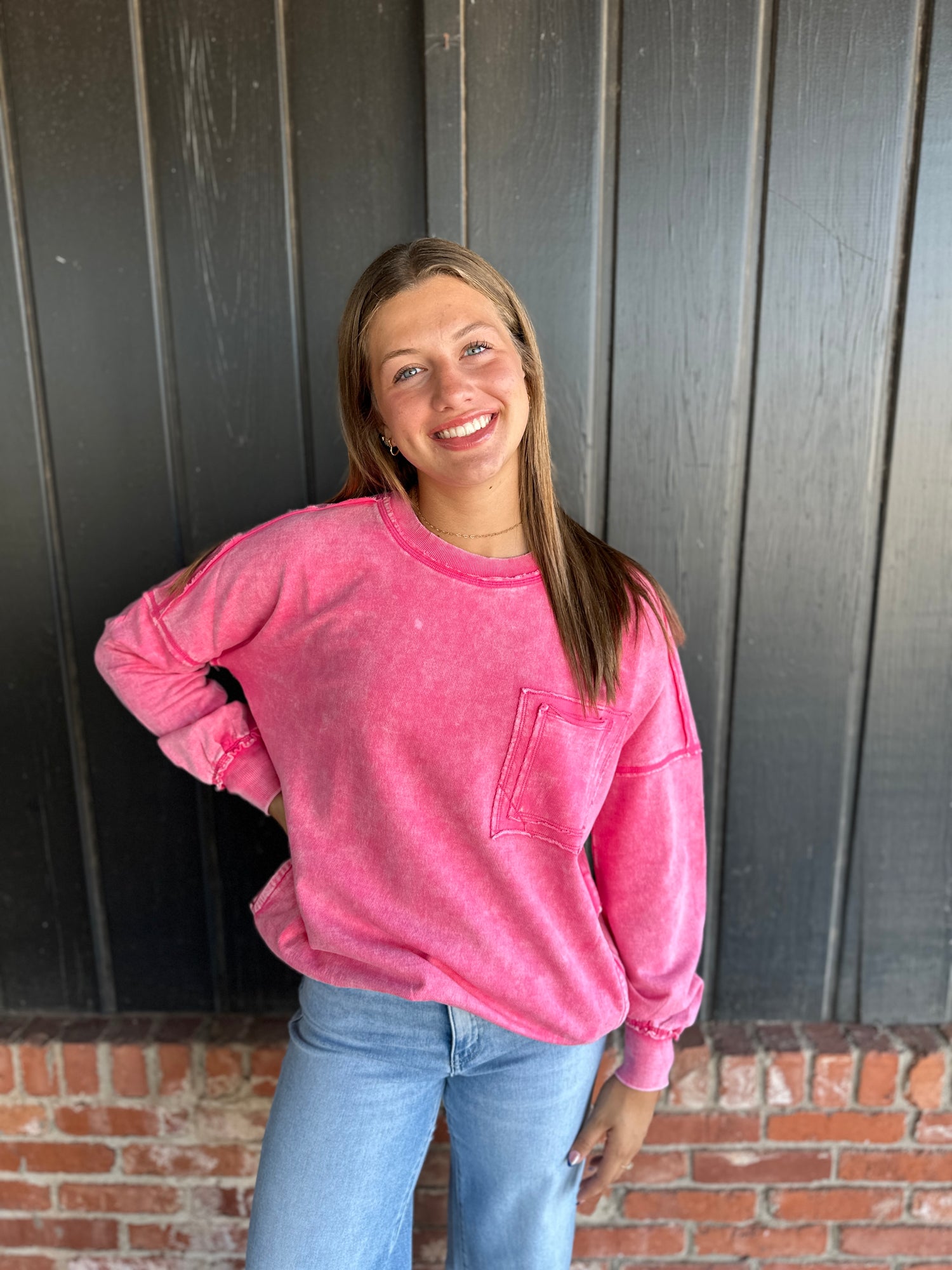FRENCH TERRY ACID WASH RAW EDGE FRONT POCKET PULLOVER WITH POCKETS