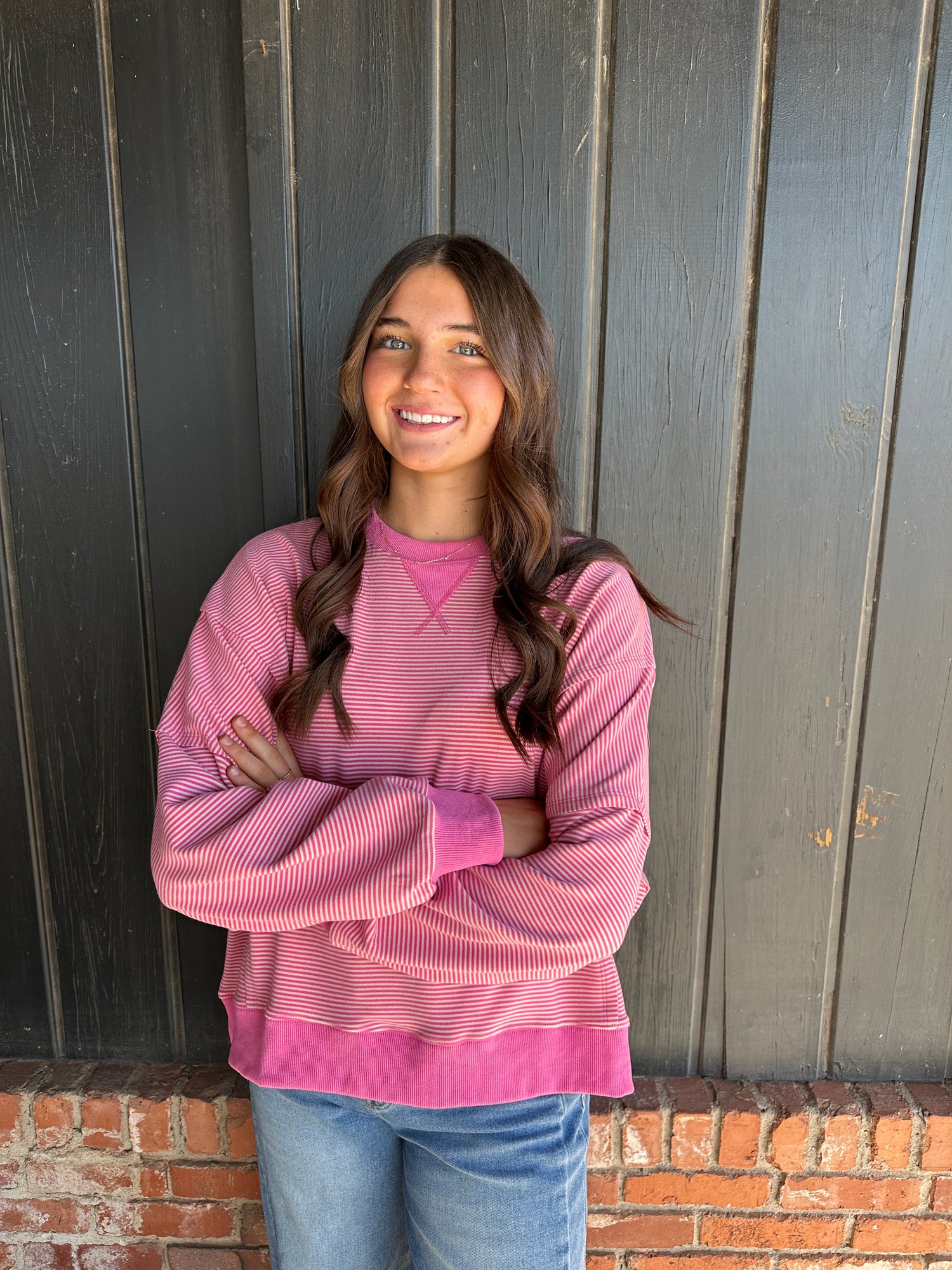 STRIPED DROP SHOULDER SWEATSHIRT - LONG SLEEVE, ROUND NECK, EASY, COMFY, RELAXED, CASUAL, EVERYDAY, DAILY, SUMMER, SPRING SELF: 93% POLYESTER, 7% SPANDEX CONTRAST: 65% COTTON, 35% POLYESTER