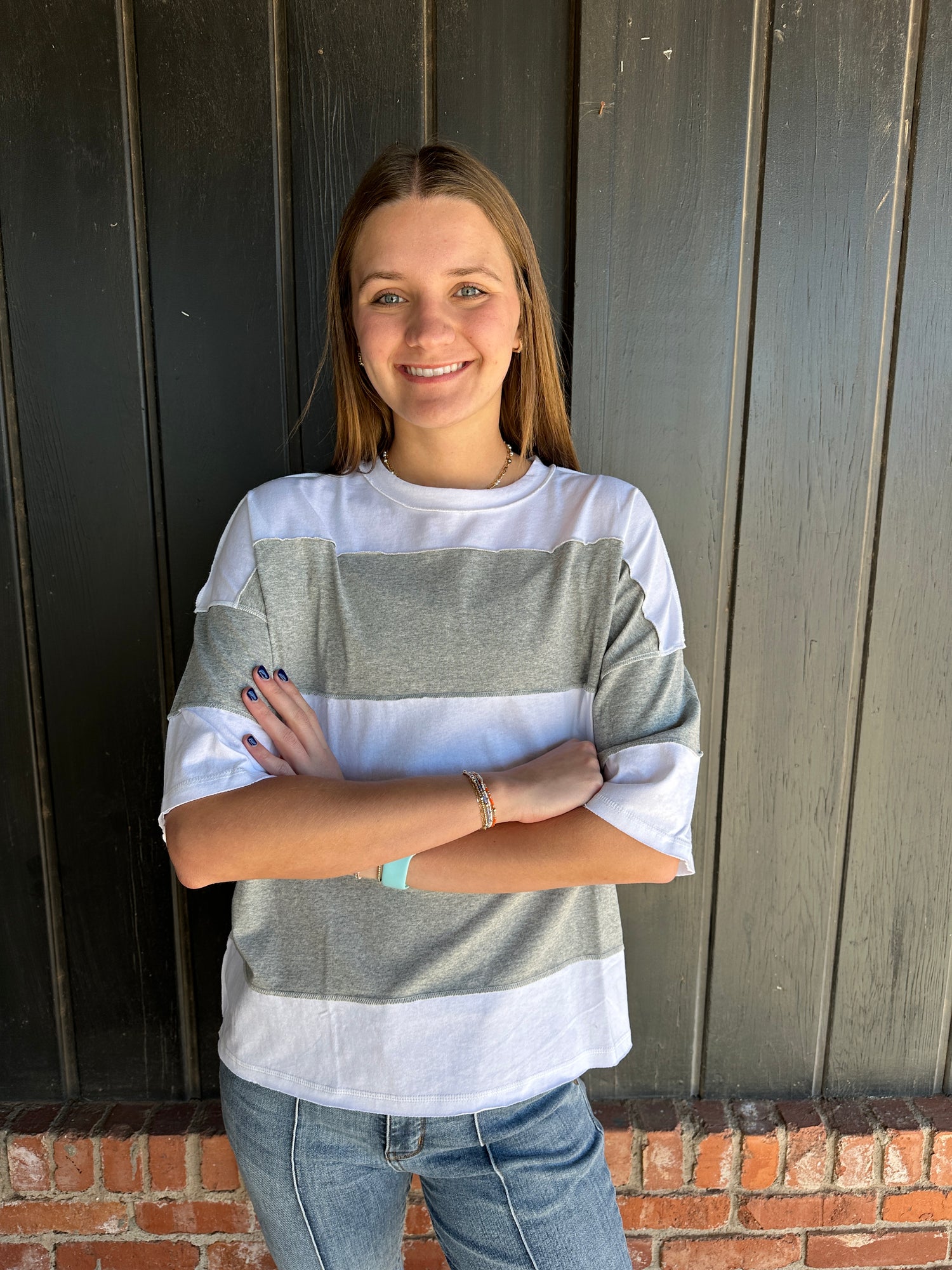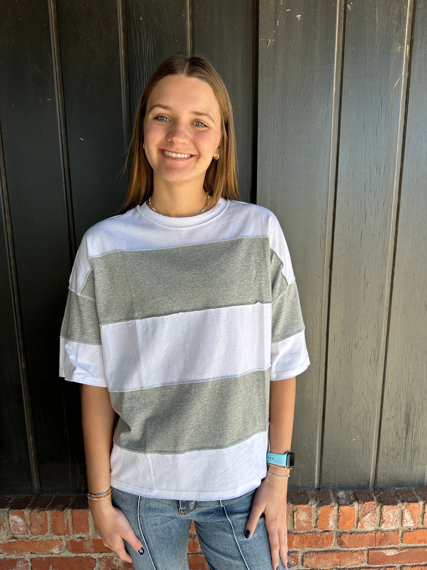This relaxed-fit T-shirt features bold navy and cream stripes with exposed seams for a casual, effortless vibe. Its oversized silhouette and breezy style make it perfect for pairing with denim shorts or leggings.