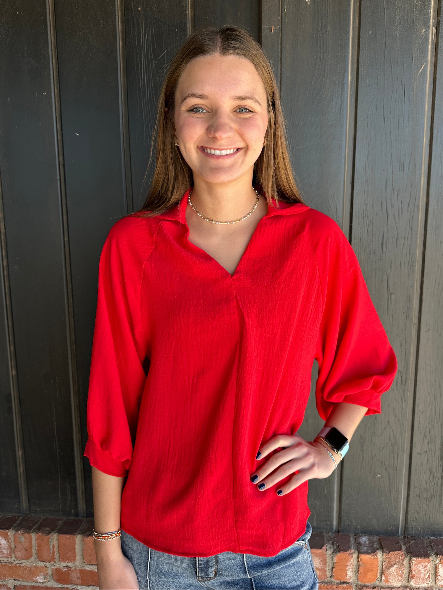 Solid collared blouse V neck Cuffed 3/4 voluminous sleeve Solid air flow fabric, slight stretch Daria is 5'9.5" Bust 33 - Waist 25 - Hips 34 Here she's wearing a size S Size S HPS Length is 26"