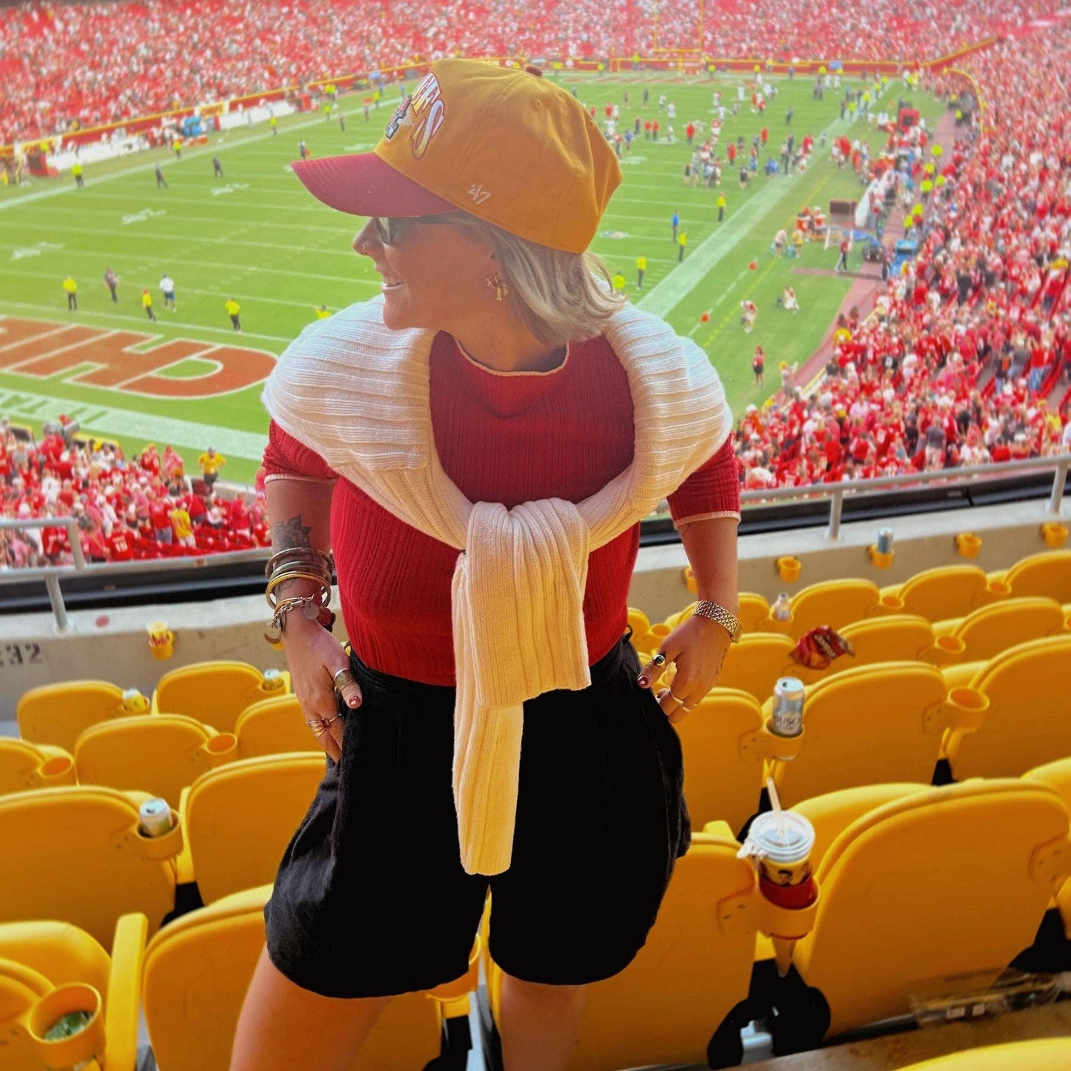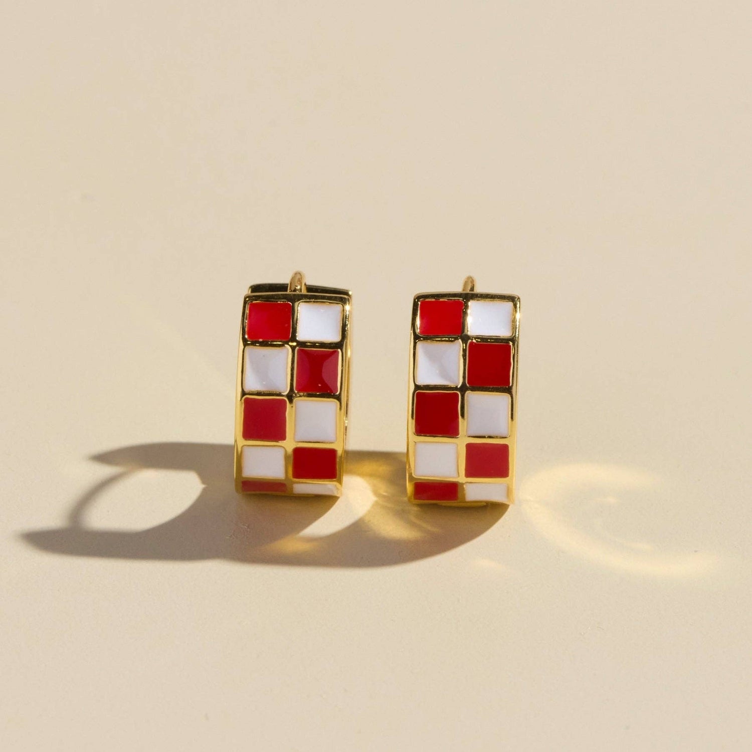 The red and white checkered enamel huggies are a wide, small gold hoop with red and white enamel that fits closely to the ear. They feature a hinge closure for comfort and wearability.
