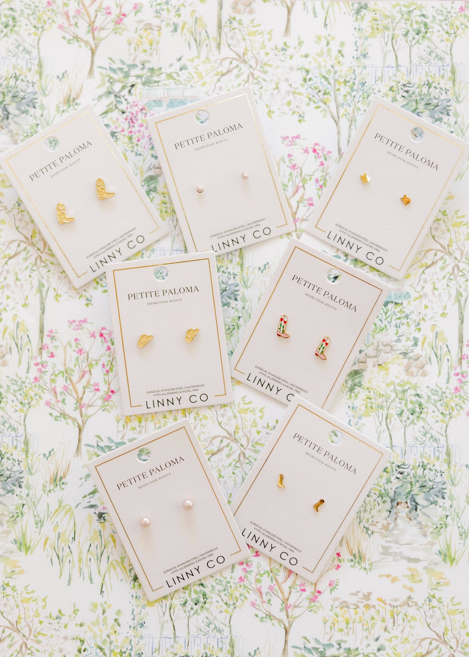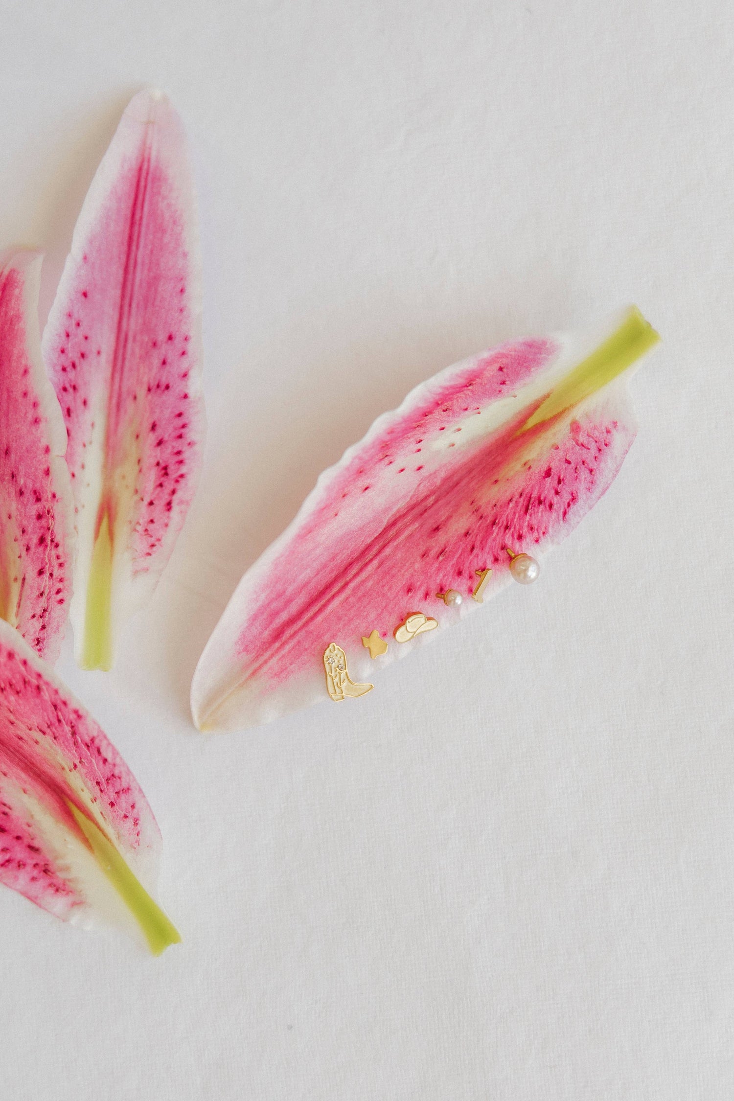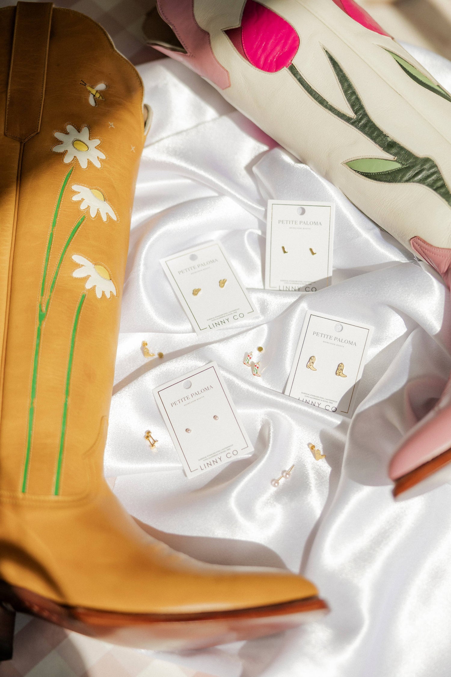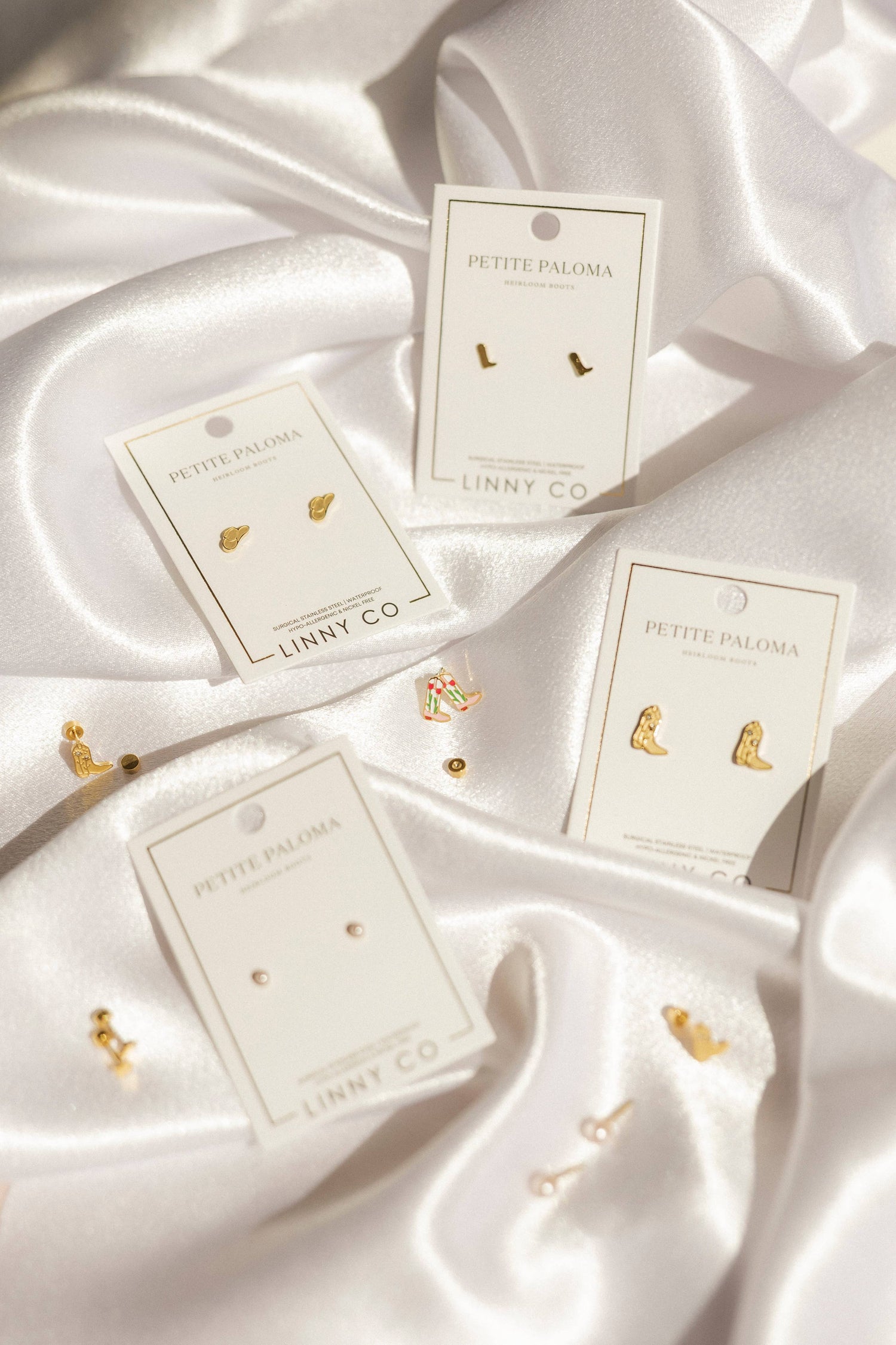 The Screwback Stud Earrings - Petite Cowgirl Boot are part of the Linny Co xx Petite Paloma Collab. These 6mm gold boot studs feature intricate detailing, adding a western-inspired flair to your jewelry collection. The screwback stud design ensures a secure and comfortable fit, making them ideal for all-day wear. Perfect for cowgirl enthusiasts or anyone looking to add a fun, stylish touch to their accessory collection.