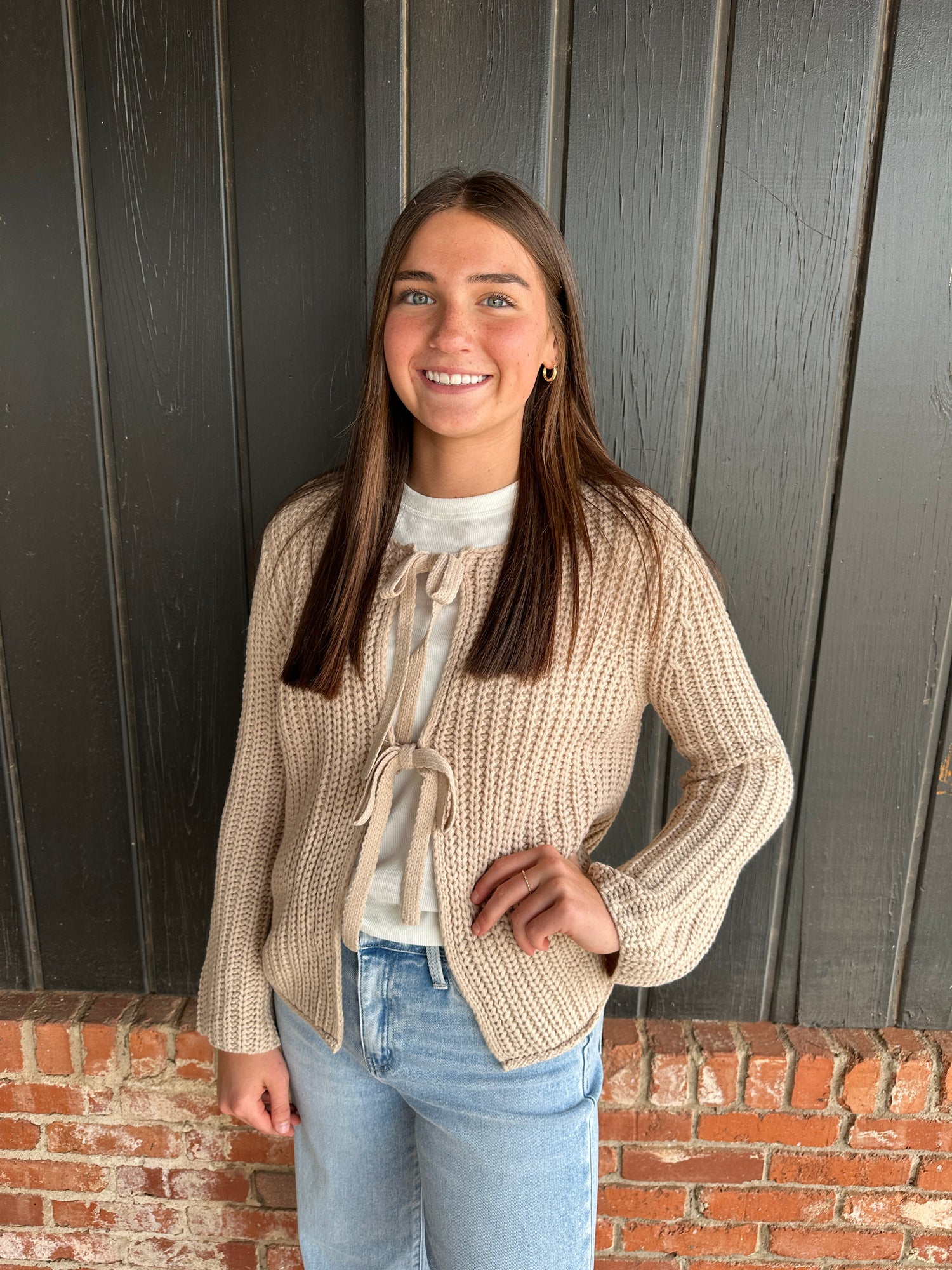 SOLID LOOSE GAUGE KNIT SWEATER TOP WITH BOW TIED CLOSURE
