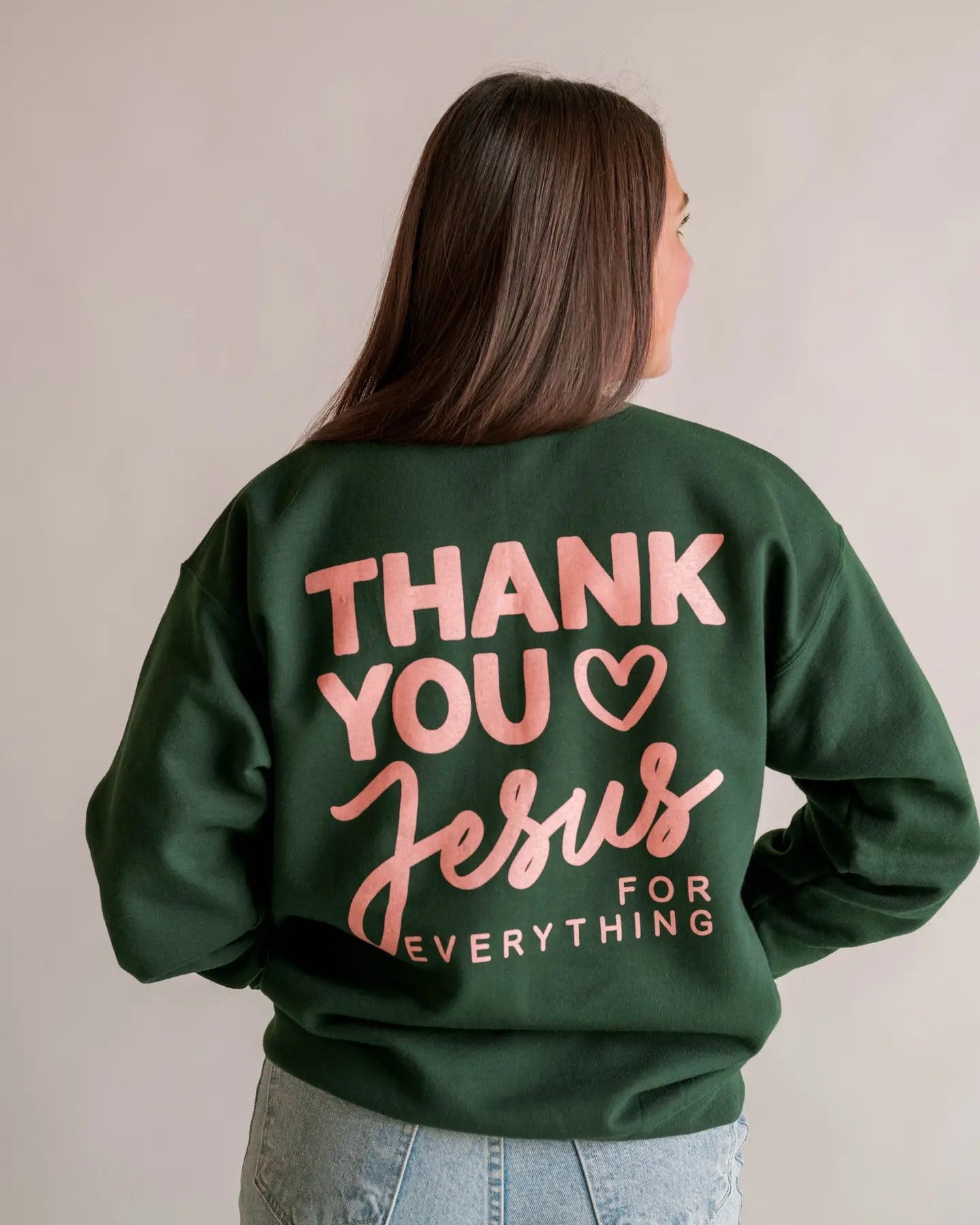 Gratitude changes everything. When we pause to whisper, “Thank You, Jesus,” our eyes shift from what we lack to all that we’ve been given. Every good and perfect gift flows from His hand—salvation, grace, daily bread, new mercies, and breath in our lungs. A thankful heart is not only for the big moments of breakthrough, but also for the quiet, ordinary days. When we remember all that Jesus has done for us—bearing our sin, offering forgiveness, making a way for us to know the Father—our natural response is worship. So let this design be a daily reminder to walk in gratitude. In every season, in every circumstance, let the words on your lips be the same: Thank You, Jesus. “Give thanks in all circumstances; for this is the will of God in Christ Jesus for you.” — 1 Thessalonians 5:18 Forest Green Pullover with Light Coral Ink 50/50 cotton/polyester Pre-shrunk