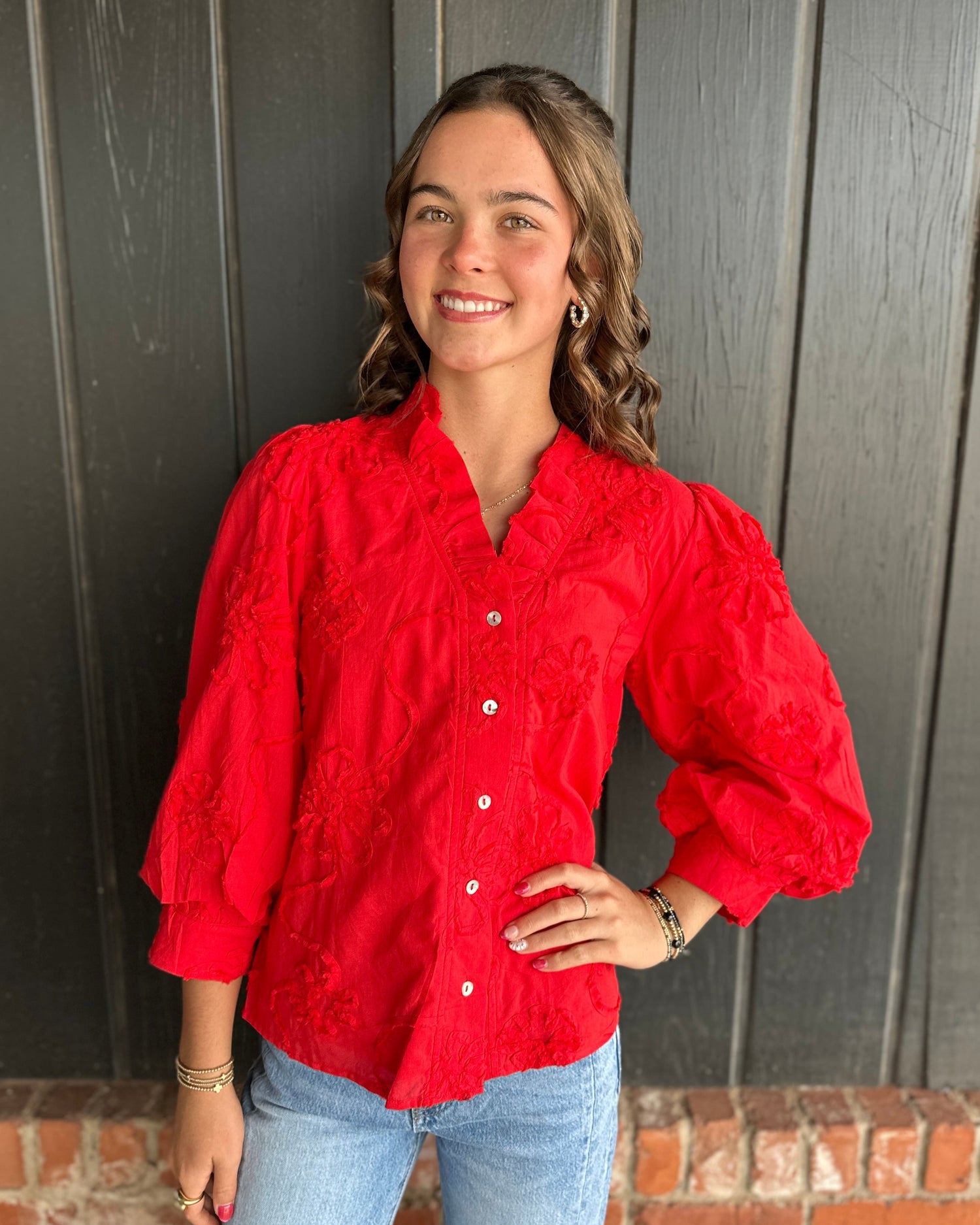 3/4 sleeves button down 3D floral top, textured fabric, ruffled neckline.