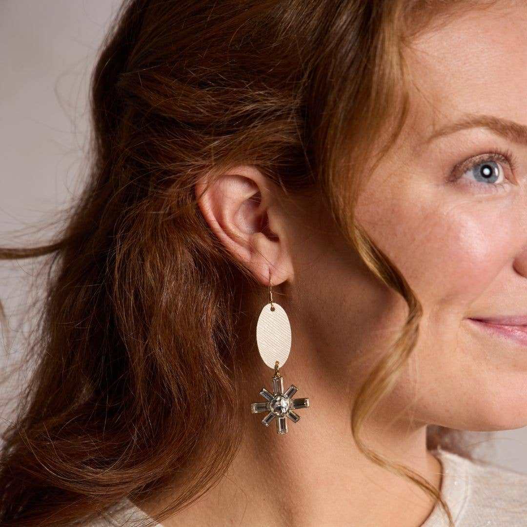The Vanilla Shimmer Zoe is made of soft creamy leather with subtle shimmer and a beautiful accent piece. The Gold Leaf Zoe features a cubic zirconia jeweled statement and the pair comes together with an asymmetrical design.