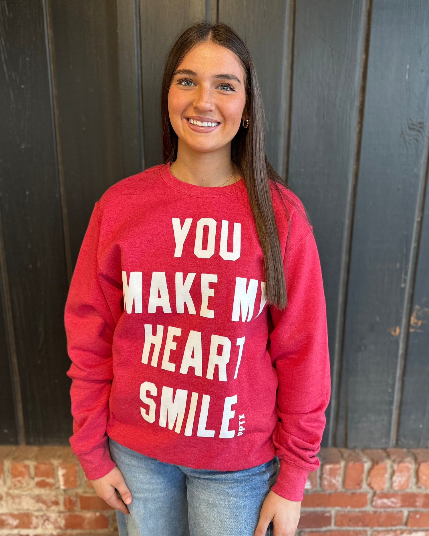 Spread love and warmth with the You Make My Heart Smile sweatshirt! This trendy and cute sweatshirt not only keeps you warm, but also conveys a heartfelt message. The heather red color adds to the charm. Show your love and make hearts smile with this must-have item!